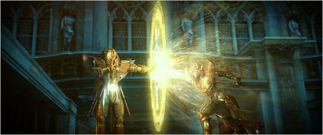 Ce Saint Seiya ne s’encombre pas de fioritures. Si Kurumada oubliait régulièrement l’importance, initiale, de la mythologie dans sa série, Keiichi Sato la délaisse totalement. Il prend l’histoire des douze maisons et fait les ajustements nécessaires pour respecter son format, et contre toute attente, beaucoup de ces ajustements sont judicieux. Les chevaliers d’or sont moins crédules que ceux d’origine, Saori ne semble plus être un si lourd fardeau, ses déplacements se font à dos de Saint et les interventions des Chevaliers d’Or sont cohérentes. Le film corrige pas mal d’absurdités de l’oeuvre originale, mais aurait mérité davantage de pellicule (oui, c’est une expression de vieux qui …) pour éviter de survoler autant son sujet. Le réalisateur a tellement peu de temps pour développer son histoire qu’il place des indices pour aiguiller le spectateur, telles que les lunettes de Mû, habituel synonyme d’érudition. Logique bien qu’étonnant. Le film va vite, très vite, trop vite. Les jeunes spectateurs habitués à la surenchère des productions américaines seront aux anges, d’autant que la technique est loin d’être à la traîne.