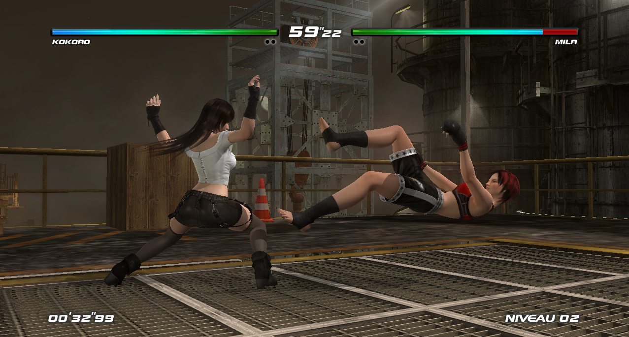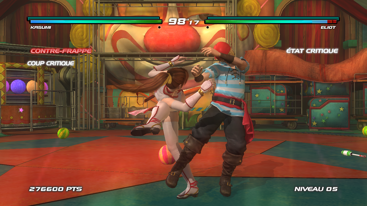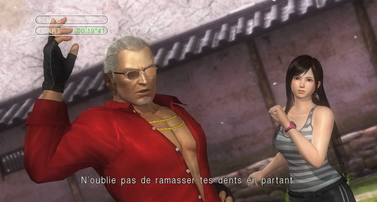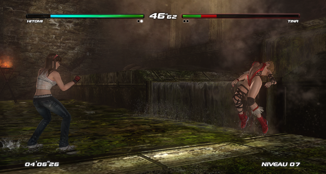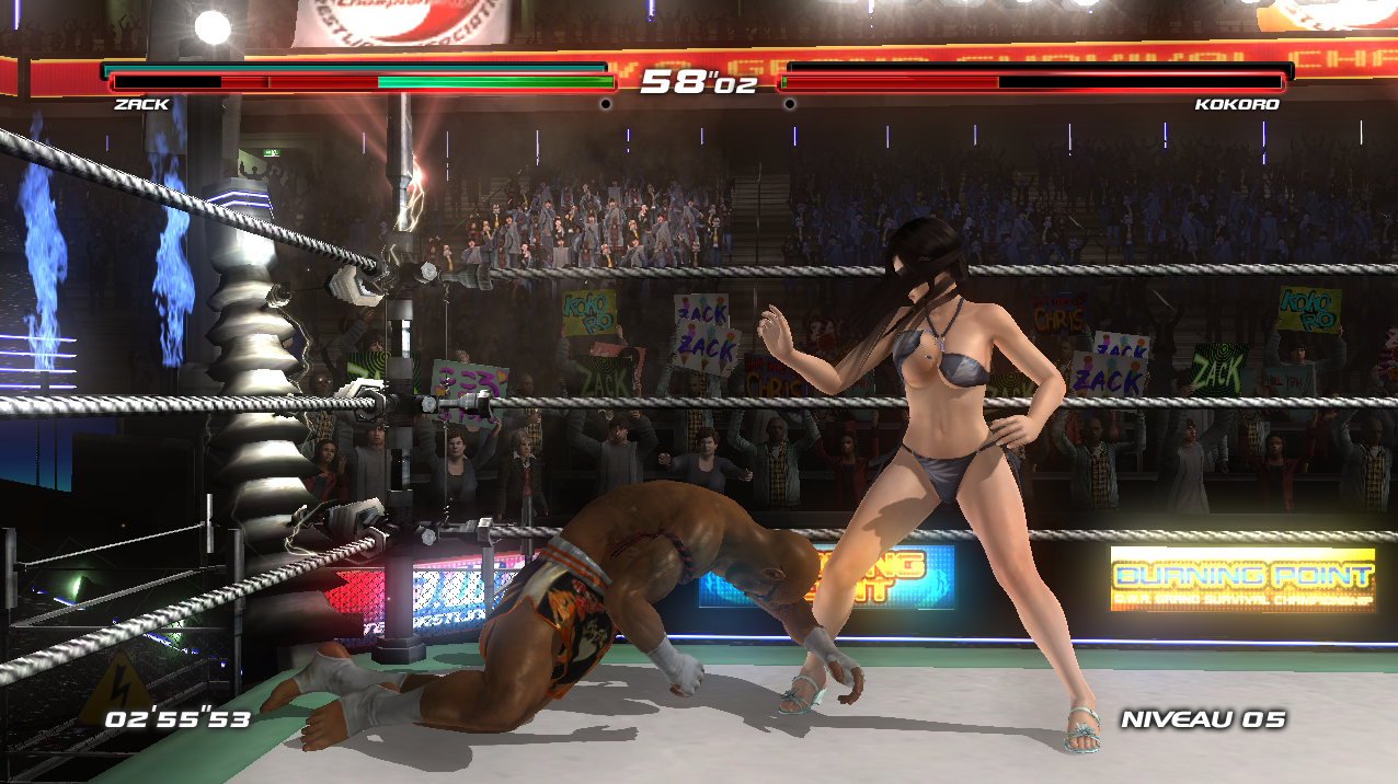 Niveau gameplay, les derniers ajustements et une base très solide font de Dead or Alive 5 : Last Round l’épisode le plus abouti. Le dynamisme est tout simplement incroyable : on apprend les touches initiales fort vite (l’accessibilité a toujours été de mise avec les DOA) mais une fois qu’on a appris les bases des esquives, et surtout des contres (essence même du système de combat de la série), des prises / contre-prises et des enchainements, le fun est décuplé ! Les joueurs chevronnés auront également leurs doses de combos à apprendre sur le bout des doigts pour sortir des attaques de feu. Le tout semble mieux équilibré que dans Dead or Alive 4, où on subissait parfois trop les enchainements, avec des combos qui pouvaient condamner d’emblée un round. Les combats en duo sont encore plus stratégiques : changer de partenaire au moment adéquat peut vous permettre d’esquiver ou d’enchainer quand il faut. Plus que jamais, Dead or Alive allie avec brio fun immédiat et intelligence de jeu pour un cocktail démentiel. Le dynamisme global est accentué par des animations tout simplement excellentes, les attaques étant toujours très fluides et rapides. La Team Ninja a, de même, re-travaillé certains détails, comme la sueur, l’eau ou la saleté sur le corps des combattant-e-s. En outre, parce que les boobs sont un peu une marque de fabrique de la série malgré tout, on peut régler le mode de mouvement des seins des filles, ce qui va des animations réalistes à celles, bien plus fantaisistes et rebondissantes, façon DOA Xtreme 2 via le mode « Ouah » (à débloquer, mais c’est facile). En plus, il y a un nouveau moteur pour le rendu des poitrines (pas dans la version PC par contre, parce qu’il ne faudrait pas laisser une autre nouveauté à cette version, hein !)… décidément, ils poussent le concept au maximum chez la Team Ninja. Cet aspect un peu osé est toujours renforcé par des poses de victoires et de défaites généralement plutôt suggestives, avec la possibilité de déplacer la caméra comme bon nous semble… Mais ce côté voyeurisme mi-assumé fait maintenant partie du charme de la série, n’est-ce pas ?