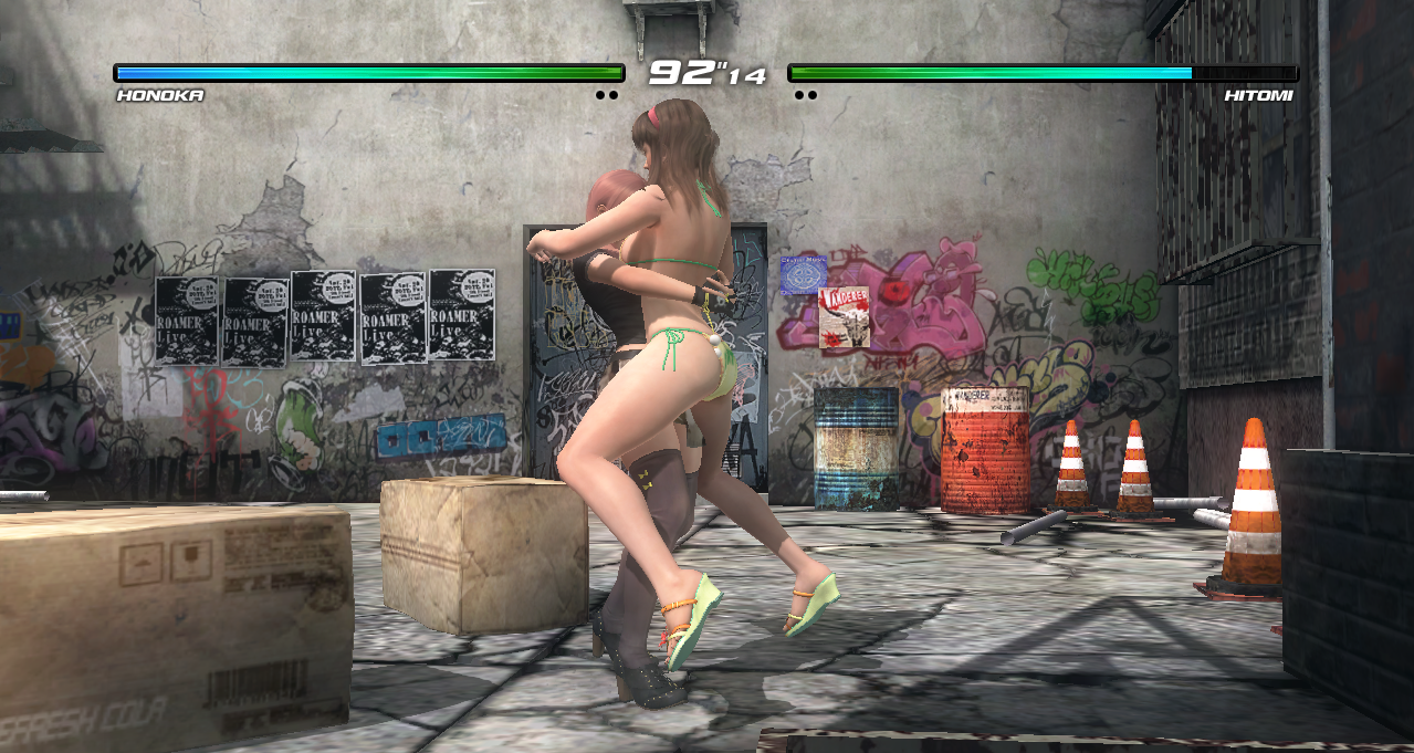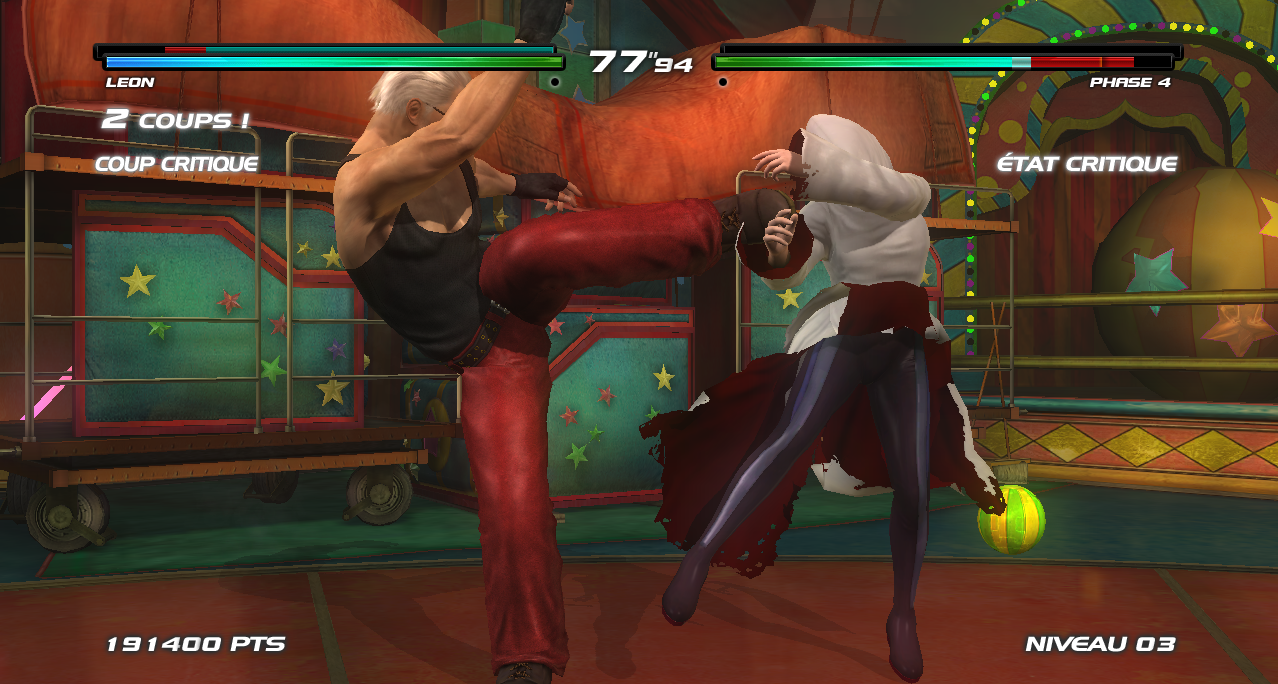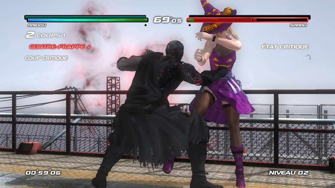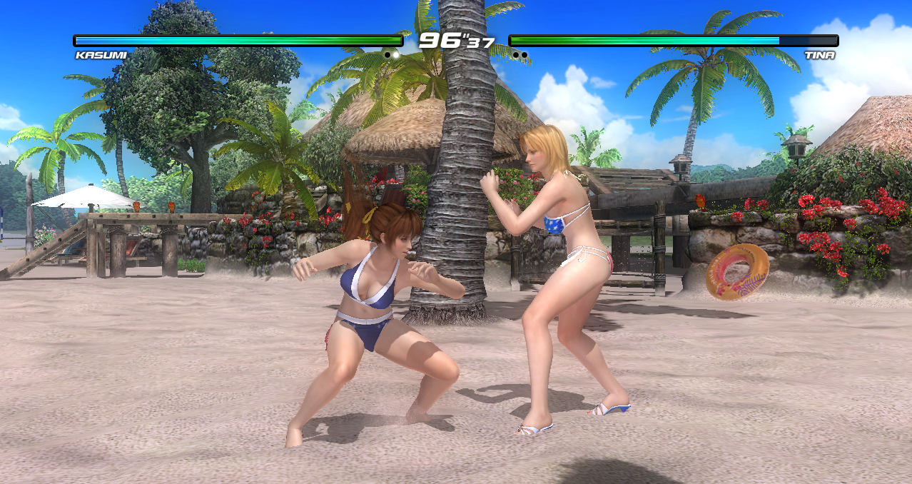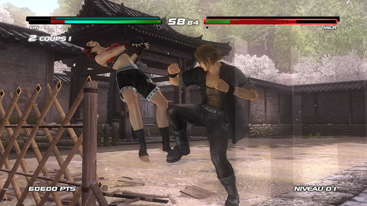 Niveau gameplay, les derniers ajustements et une base très solide font de Dead or Alive 5 : Last Round l’épisode le plus abouti. Le dynamisme est tout simplement incroyable : on apprend les touches initiales fort vite (l’accessibilité a toujours été de mise avec les DOA) mais une fois qu’on a appris les bases des esquives, et surtout des contres (essence même du système de combat de la série), des prises / contre-prises et des enchainements, le fun est décuplé ! Les joueurs chevronnés auront également leurs doses de combos à apprendre sur le bout des doigts pour sortir des attaques de feu. Le tout semble mieux équilibré que dans Dead or Alive 4, où on subissait parfois trop les enchainements, avec des combos qui pouvaient condamner d’emblée un round. Les combats en duo sont encore plus stratégiques : changer de partenaire au moment adéquat peut vous permettre d’esquiver ou d’enchainer quand il faut. Plus que jamais, Dead or Alive allie avec brio fun immédiat et intelligence de jeu pour un cocktail démentiel. Le dynamisme global est accentué par des animations tout simplement excellentes, les attaques étant toujours très fluides et rapides. La Team Ninja a, de même, re-travaillé certains détails, comme la sueur, l’eau ou la saleté sur le corps des combattant-e-s. En outre, parce que les boobs sont un peu une marque de fabrique de la série malgré tout, on peut régler le mode de mouvement des seins des filles, ce qui va des animations réalistes à celles, bien plus fantaisistes et rebondissantes, façon DOA Xtreme 2 via le mode « Ouah » (à débloquer, mais c’est facile). En plus, il y a un nouveau moteur pour le rendu des poitrines (pas dans la version PC par contre, parce qu’il ne faudrait pas laisser une autre nouveauté à cette version, hein !)… décidément, ils poussent le concept au maximum chez la Team Ninja. Cet aspect un peu osé est toujours renforcé par des poses de victoires et de défaites généralement plutôt suggestives, avec la possibilité de déplacer la caméra comme bon nous semble… Mais ce côté voyeurisme mi-assumé fait maintenant partie du charme de la série, n’est-ce pas ?