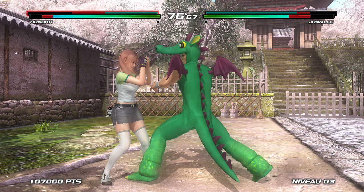 Bon, ce début de test peut un peu vous effrayer, mais pourtant, rien de bien méchant. Ceux qui possèdent les versions consoles et qui se moquent des DLC (ou ceux pour qui dépenser pour ces costumes n’est pas un problème, ce qui est également respectable) seront assurément aux anges. Les points forts de la série ont souvent été distinguables : des arènes interactives, un casting explosif, un gameplay dynamique et accessible et des graphismes à la hauteur. Dead or Alive 5 : Last Round permet ainsi de réunir toutes ces qualités et de proposer un contenu énorme à la fois quantitativement et qualitativement. On reprochait aux arènes de Dead or Alive 5 d’être un peu trop statiques, alors qu’une des particularités de la série était justement ces niveaux interactifs et à plusieurs étages. Depuis le temps, de nouvelles arènes (ou les retours d’anciennes) ont permis d’ajouter un peu plus d’interactions à l’ensemble. Sur les 34 jouables au total, certaines sont relativement quelconques, mais d’autres s’avèrent être vraiment funs. Concernant le casting, difficile de faire la fine bouche : 34 combattant-e-s sont au rendez-vous, dont deux inédits à Last Round : Raidou qui était le boss du tout premier volet, et Honoka, pour le coup une nouvelle venue dans la saga. Sûrement l’un des meilleurs personnages récents de la série en terme de design, mais un peu plus compliquée à appréhender manette en main avec des attaques à la portée globalement faible (compensées en partie par une grande vitesse), mais à terme et avec de la maitrise, un perso plus qu’intéressant.