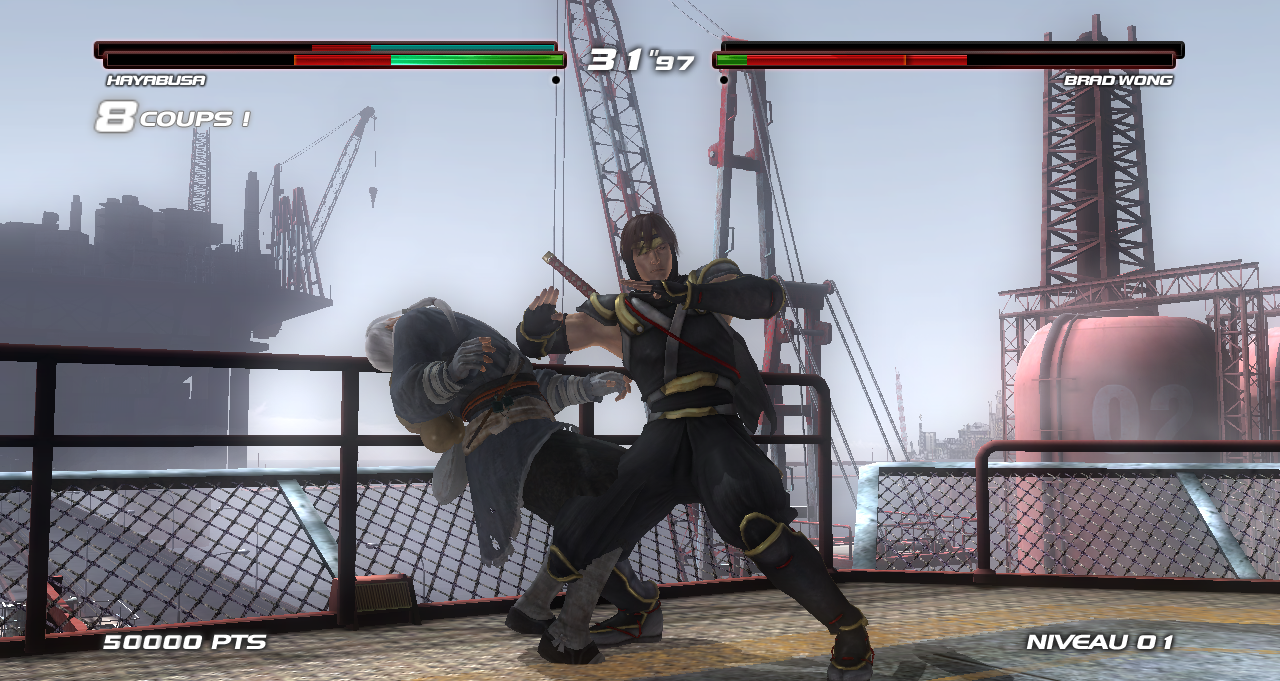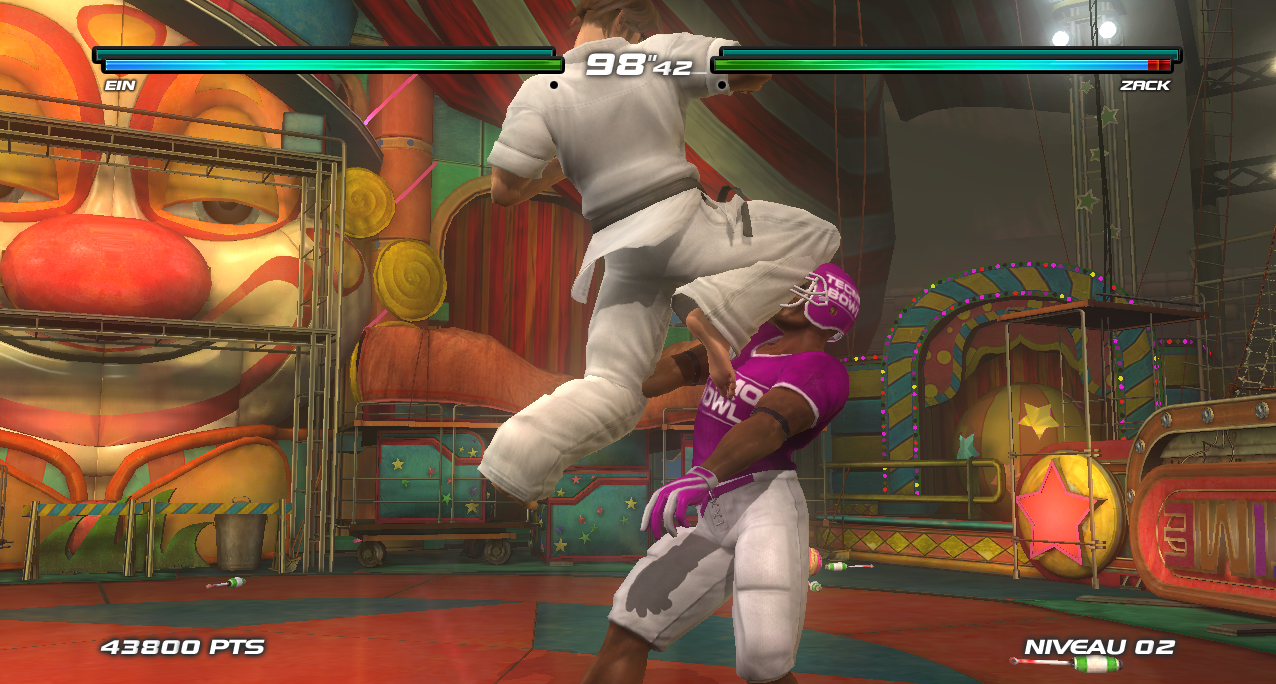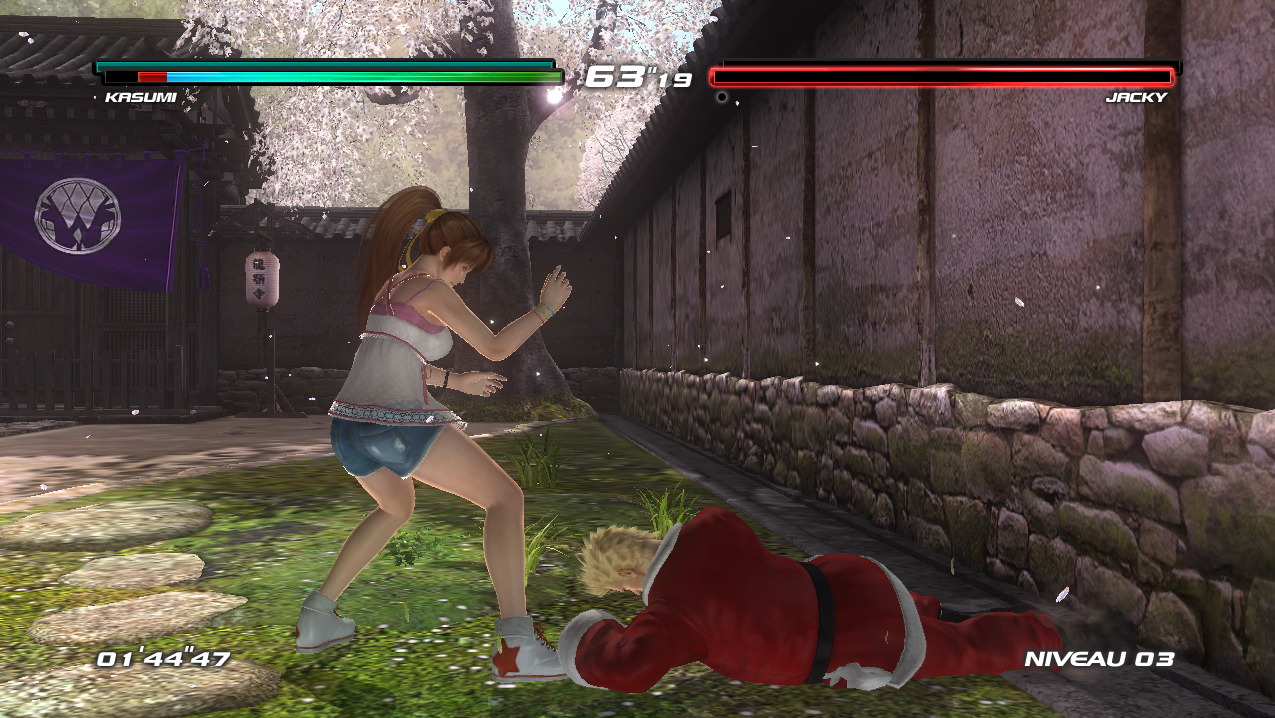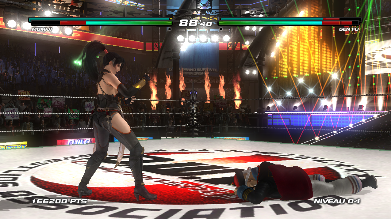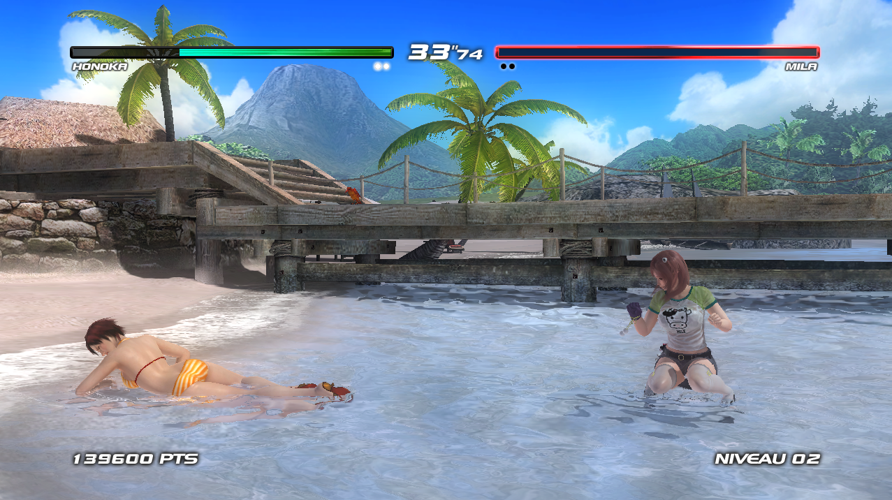 Dans le reste du casting, on retrouve évidemment des grands noms (Kasumi, Ayane, Hayate, Hayabusa, Ein, Zack, Jann Lee, Tina…), ainsi que les invités de Virtua Fighter (Akira, Jacky, Pai, Sarah) et de Ninja Gaiden (Rachel, Momiji) et les revenants de la version Ultimate (Marie-Rose, Nyotengu, Phase-4). Cela donne un roster extrêmement varié, probablement le plus équitable en terme de nombre de combattant-e-s des deux sexes parmi les jeux de combat, avec des styles de combats divers et originaux et des looks multiples histoire de pouvoir satisfaire tous les goûts. Et puis, le nombre de costumes assez hallucinant (plus de 400 de base) en plus des options permettant de personnaliser davantage notre personnage (lunettes, coiffure…) renforce les possibilités du titre. Si le nombre de costumes est assez inégal d’un combattant à l’autre (souvent : entre 20 et 23 pour les filles « anciennes », entre 10 et 13 pour les hommes « anciens » et entre 5 et 10 pour les plus récent-e-s), restent que la variété est bien là. Certes, on retrouve certains costumes d’un perso à l’autre (par exemple, l’équipement de footballeur américain pour les hommes ; ou bien les sous-vêtements avec oreilles de lapins pour les filles), chacun dispose tout de même de ses propres tenues, allant du plus loufoque (surtout avec Zack !) au très sexy (chaque nana a par ailleurs son propre maillot de bain, issu de Dead or Alive Xtreme 2, clin d’oeil sympathique). Ceci dit, si on parle beaucoup des bikinis, sachez qu’il y a d’autres tenues elles aussi très aguicheuses, mais plus classes. Le jeu a en outre le mérite de ne pas être contraignant dans l’obtention des bonus : on peut les avoir grâce à plusieurs modes de jeu et on peut aller plus vite en jouant en duo. Une bonne chose.