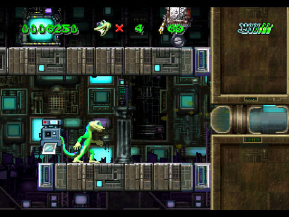 Comme évoqué plus haut, la petite équipe de Crystal Dynamics (où l’on croise d’ailleurs Evan Wells, futur PDG de Naughty Dog, ici à la programmation) a suivi le mouvement en proposant à leur personnage d’errer dans des mondes dédiés à de la plateforme pure et dure, car après tout, c’était la mode à l’époque, ou du moins, au démarrage du projet. Là où pas mal de titres se sont plantés avec des contrôles exécrables, Gex parvient à être globalement agréable dans son gameplay une fois les mouvements acquis et les quelques particularités de ces derniers acceptées. Notre animal verdâtre est comme son homologue réel plutôt polyvalent, et dispose ainsi une palette assez fournie d’actions, puisque qu’il pourra utiliser sa queue pour frapper ennemis et objets ou encore rebondir sur certaines surfaces, sa langue pour attraper différents types de mouches, ou encore compter sur ses pattes collantes (des setæ) pour s’accrocher aux parois propices aux accès à des endroits plus avancés. Pour le reste, pas de surprises : des ennemis à taper sans l’être soit même, des plateformes qui bougent, des sauts millimétrés, des trucs à récupérer, des passages secrets à trouver… Si les premiers niveaux s’avèrent plutôt simples à parcourir avec des tracés lisibles, les plus proches du bout de la galette, plus étroits et bourrés de pièges, demanderont une certaine patience vu que le jeu décide parfois de nous décrocher d’une cloison alors qu’aucun obstacle ou vide se présentait au détour de celle-ci. De même, certaines personnes pourront trouver perturbant qu’à chaque fois que Gex prend un coup, l’action se fige pendant une bonne seconde et semble annuler tout saut entrepris, nous laissant quelque peu dans une panique de l’instant résultant sur un mauvais rattrapage, généralement dans un trou ou dans la lave. Fort heureusement, Gex dispose d’un level-design réussi et n’est absolument pas chiche en vies, recharges d’énergies ou autres bonus temporaires d’invincibilité et de lancers de projectiles, à condition de retenir les codes couleurs des mouches qui les fournissent. Ceci ne sera pas de trop pour un titre qui peut se boucler une bonne après-midi mais dont la difficulté augmente exponentiellement au fur et à mesure, qui offre pas mal de tableaux supplémentaires cachés, et un lot de boss plutôt conséquent, dont un de fin assez fastidieux. On notera d’ailleurs que si la version 3DO dispose d’une sauvegarde sur la mémoire de la console, les moutures Saturn et PlayStation demanderont de noter des mots de passe fournis à certains moments de l’aventure, Beam Software n’étant visiblement pas parvenu à boucler l’implémentation du système de sauvegarde plus moderne sur ces supports. Pas sûr, en effet, qu’il s’agisse d’un hommage à la génération précédente.