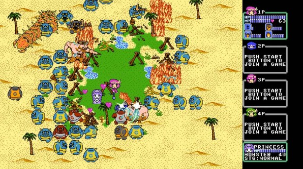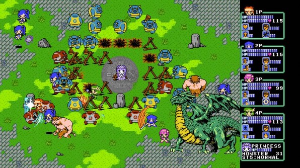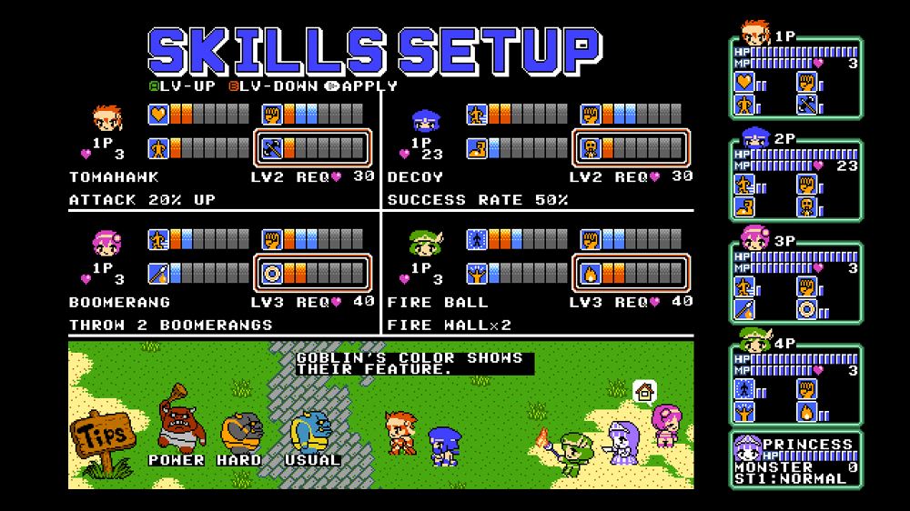 Librement inspiré des towers-defense, le seul et unique but du joueur sera de protéger la princesse d’assauts ennemis de plus en plus forts et de plus en plus nombreux. Il pourra être accompagné par trois compères en local (pas de mode en ligne), ce qui se révèle indispensable à partir de la difficulté normale, mais surtout augmente le fun de manière exponentielle. On aura le choix entre quatre classes de héros différentes (avec leurs couleurs personnalisées) : Chevalier, Amazone, Magicien et Ninja. Sans surprises, chacune d’entre elles ont leurs attributs et défauts qui leurs sont propres, mais qui à l’unisson s’avèrent être un cocktail très efficace. En plus d’une attaque de base, chaque personnage possède sa super attaque pour envoyer balader n’importe quel prétendant à la baston, contre bien évidemment quelques MP. En face, gobelins, zombies, minotaures et autres monstres apparaîtront par petites vagues pour arriver en fin de round en gros comités plein de rage avec quelques fois la présence d’un imposant boss. A chaque fin de niveau, on pourra augmenter les statistiques de son héros selon ses goûts en échange de précieux cœurs donnés par la princesse en réalisant des combos, pour ainsi repartir encore plus fortifié dans la bataille.