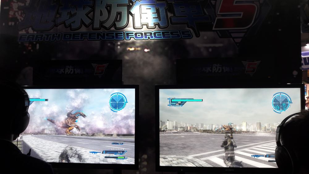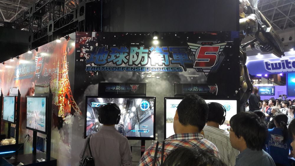 AVIS DE VIDOK : Earth Defense Force est un plaisir coupable. La série, chère dans le coeur de l’ami Mizakido, a toujours été plombée par des tares techniques, à tel point qu’elles en sont devenues de marques de fabrique. Un EDF doit être laid et mal animé. Les fans peuvent être rassurés : ce cinquième épisode ne déroge pas à la règle. Tournant sur Playstation, il est évidemment plus fin mais reste honteux pour le support. La démo du TGS laisse penser que la fluidité sera, elle aussi, meilleure. D’ailleurs parlons-en de cette démo. 4 niveaux au choix. Les 60 minutes d’attente pour Idol Death Game TV auront au moins servi à observer les quatre niveaux possibles et ainsi de faire son choix en amont. De mémoire, un niveau classique contre des fourmis, un niveau dans lequel le joueur débute au fond d’une base souterraine pour finir à l’air libre, un niveau face à un kaiju (énorme monstre imaginaire, type Godzilla) et un dernier face à la nouvelle variété d’ennemis, les grenouilles géantes. Le niveau du Kaiju était très intéressant – le joueur étant aussi gros que son orteil – mais beaucoup de joueurs le sélectionnait, tout comme celui de la base souterraine. J’ai donc opté pour les grenouilles. Larguées depuis des vaisseaux spatiaux indestructibles – ce qui fait se poser des questions au démarrage sur ce qu’ils contiennent – elles sont en effet aussi grandes que des immeubles. Cette partie en Normal permettait de les exterminer en un rien de temps à coup de lance-roquettes. L’essence des EDF est bien là : les niveaux sont entièrement destructibles, des kits de soin et de nouvelles armes jonchent le sol. Cela commence doucement pour exploser dans tous les sens ensuite. Cet EDF 5 semble être bon cru, D3 PUblisher faisait d’ailleurs en sorte de le promouvoir sur sa scène et sa décoration très Earth Defense Force. A noter que toutes les hôtesses étaient aux couleurs du jeu, le logo dessiné à la fois sur le sein gauche et le bas du dos… D3 PUblisher.