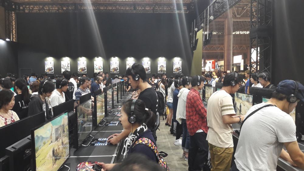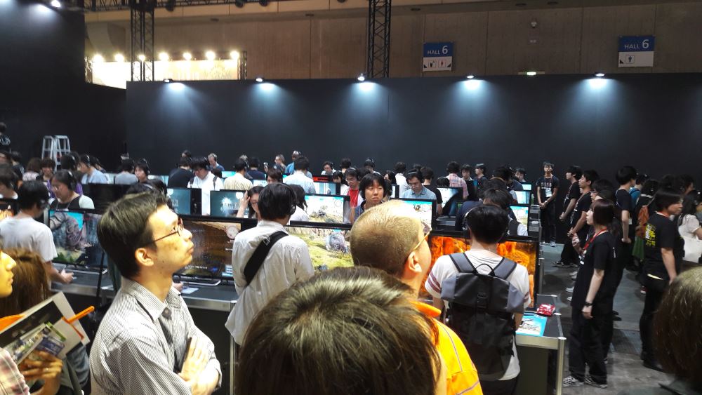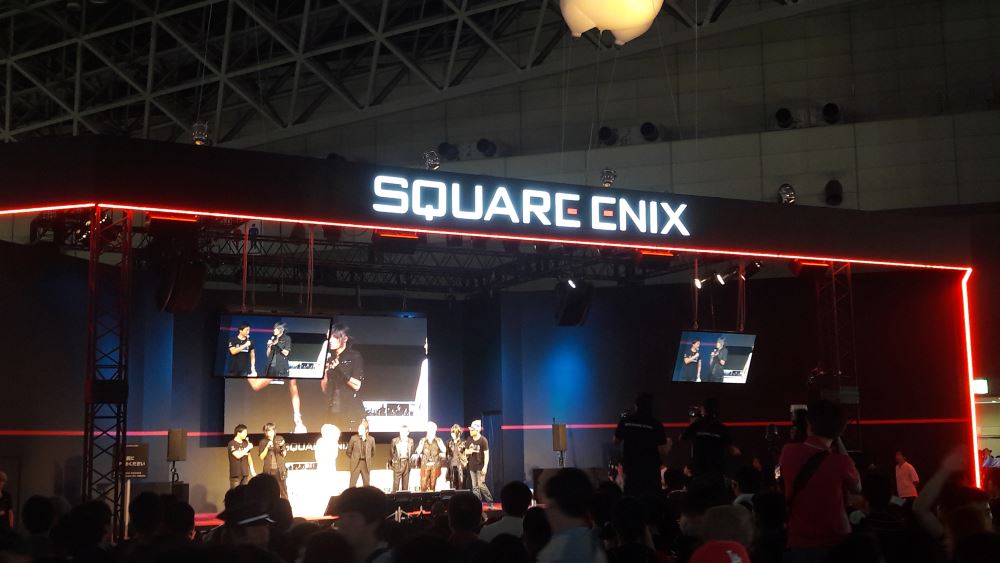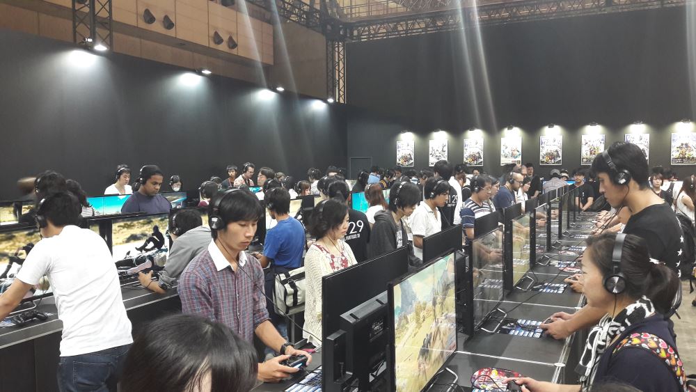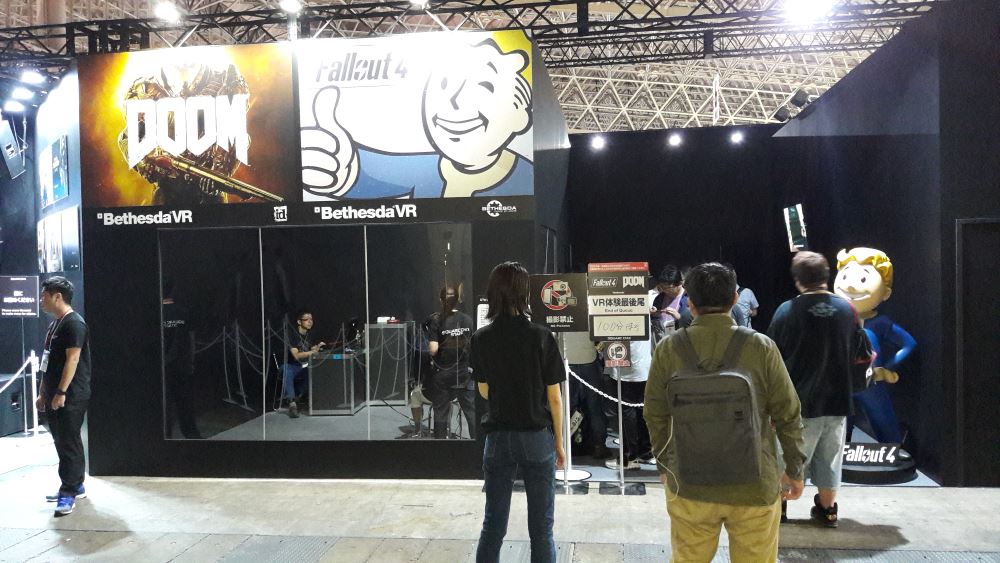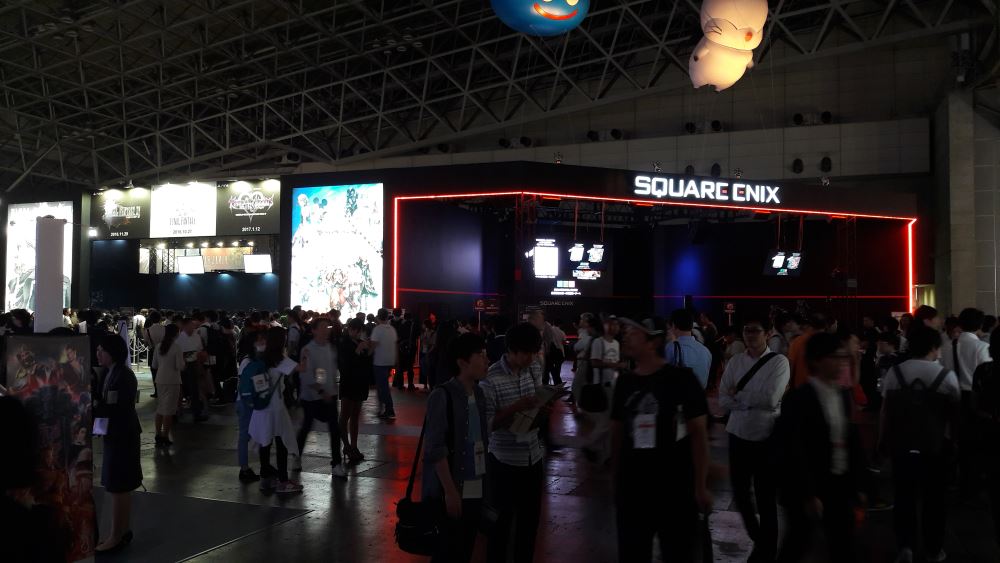 Le stand Square Enix était l’un des plus prisés du Tokyo Game Show, évidemment. Final Fantasy XV en occupait la majeure partie et avait très certainement la file d’attente la plus longue du salon. Square Enix l’avait anticipé en la faisant commencer de l’autre côté du stand, cachée, pour la faire repiquer à l’intérieur, traverser le stand et repasser devant histoire de faire croire aux chalands qu’elle n’était pas si longue. Pourtant, ce n’était pas la seule cartouche dans le fusil du géant japonais, bien au contraire : World of Final Fantasy et Kingdom Hearts 2.8 Final Chapter Prologue (!) répondaient eux aussi présents, attirant eux aussi de très nombreux visiteurs. Tout de noir vêtu, il s’agit très certainement du stand éditeur console le plus sobre du TGS mais pas le moins impressionnant comme vous le remarquerez sur les photos ci-dessous. Square Enix a utilisé sa scène pour faire diverses annonces telles que la sortie en février 2017 d’un Dragon Quest Monsters Joker 3 Professionnal, pour donner la date de sortie de Nier Automata ou encore annoncer en fanfare son nouveau titre d’action : Flame x Blaze, un MOBA free to play sur Android… Oui, nous y étions… Bref. Afin de combler l’espace restant, des partenaires et notamment Besthesda avec Fallout 4 VR et Doom VR, comme leurs noms l’indiquent, il ne s’agit que de versions compatibles casques VR rien de plus rien de moins. Il y avait également une étonnante présentation d’un manga en VR : les personnages y prennent vie façon hologramme. Nous n’avons pu tester l’intérêt de la chose, les japonais, eux, en revanche, y allaient avec joie, en témoignent l’heure de queue.