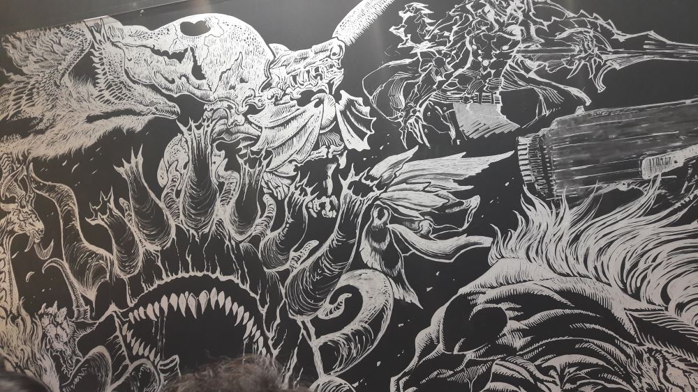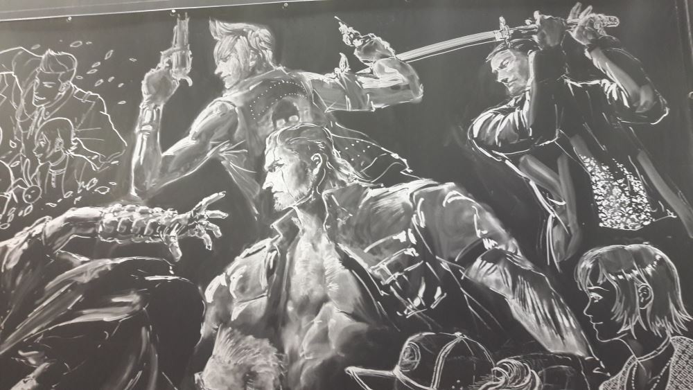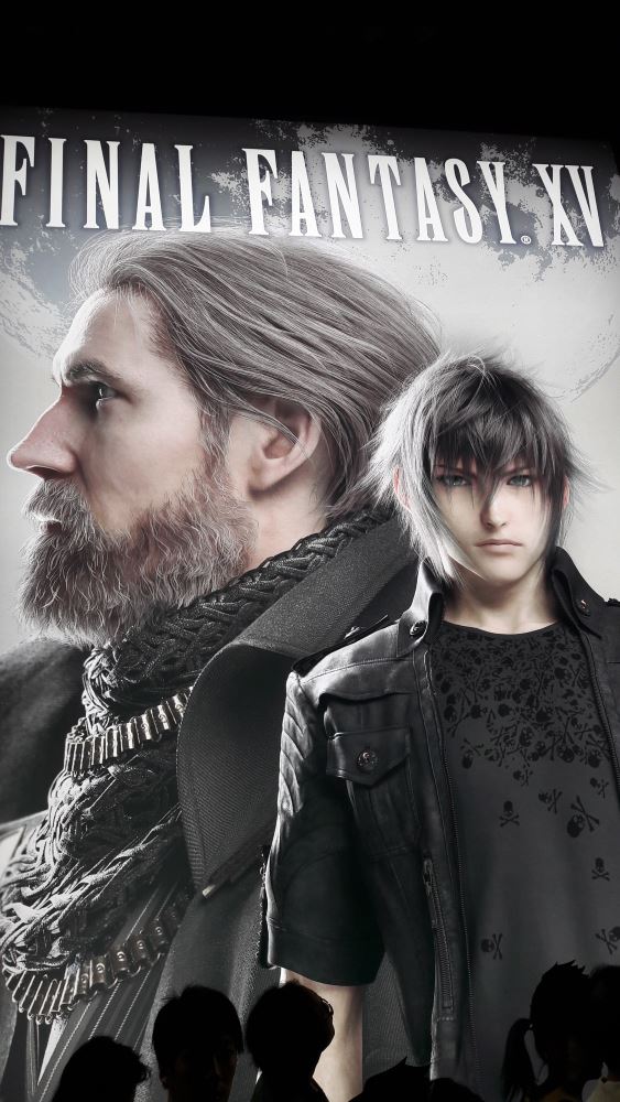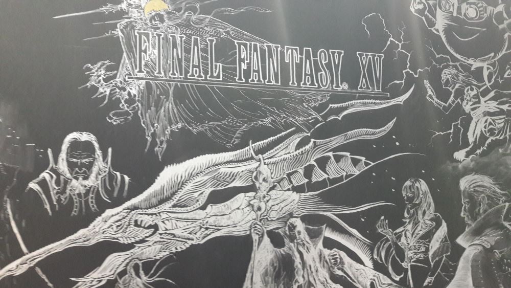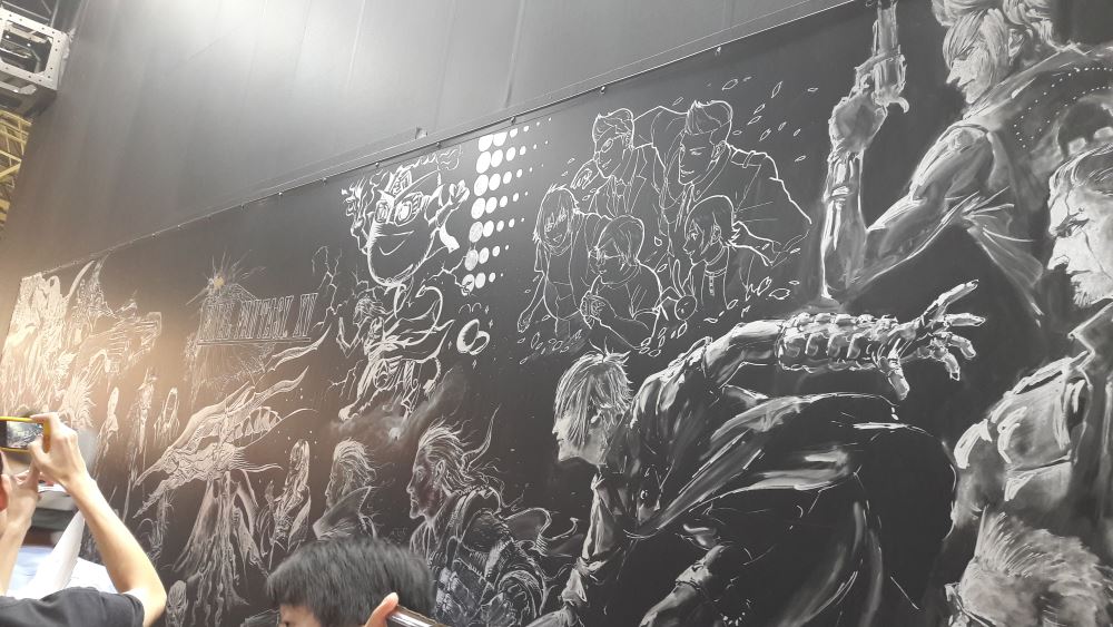 150 minutes de queue en week-end pour jouer à la dernière fantaisie, oui madame monsieur, c’est le temps attendu par votre serviteur le samedi pour satisfaire sa curiosité – avancer dans Criminal Girls 2 – et vous faire une petite restitution aujourd’hui. Heureusement que le chemin était pavé de bonnes inten de fresques absolument superbes, peintes sur le stand pendant les deux premiers jours de salon. 36 bornes dont 31 PS4 et 5 Xbox One. Microsoft était donc bel et bien représenté mais le rapport de force était à l’avantage du japonais. Duscae était très intéressante mais ses nombreux bugs de collision et son système de combat brouillon, peu aidé par une caméra souvent aux fraises, ne rassurait pas vraiment. Platinum, située en dehors du scénario du jeu, laissait croire que le jeu était devenu le brouillon de Kingdom Hearts III. La démo était finalement peu intéressante et n’avait même pas fait l’objet d’un article sur Archaïc.fr. Cette nouvelle démo essaie de nous rabibocher très tôt en nous montrant l’avenir : un démon gigantesque, visiblement très sûr de lui, damant le pion à notre troupe de bros. Pouf, flashback : revoilà notre quatre jeunes dans le vent en voiture, très vite en panne. La démo descend donc d’un cran en intensité en nous demandant de pousser la voiture quelques longues secondes, l’occasion de voir qu’elle est bien sur rail. Rencontre avec Cindy : elle nous réclame de l’argent pour la réparer et donc commandite l’extermination de plusieurs monstres dans les montagnes. Oui, Final Fantasy XV est toujours aussi beau, les trailers ne mentent pas. Entre les superbes scènes cinématiques, les décors photo-réalistes fourmillant de détails ou les personnages parfaitement modélisés, le titre de Square Enix confirme son statut de blockbuster. Heureusement. Arrivent très vite les combats : on maintient Rond. Le Rond fait tout : le héros défouraille alors automatiquement les ennemis. La caméra se place correctement, il est simple d’esquiver et de changer d’adversaire. Les menus, finalement peu envahissants, sont plutôt simples à appréhender. Et surtout ils ne sont pas trop intrusifs. Même la téléportation paraît innée, sauf quand il s’agit d’aller s’agripper en hauteur, système qui demande un minimum d’habitude. Et malheureusement, 25 minutes de démo, en incluant les cinématiques, ça défile à toute berzingue, même pas eu le temps de tester toutes les subtilités des affrontements. Il n’en demeure pas moins qu’elle m’a considérablement rassuré. Faite à partir du build de la précédente version Gold, celle qui aurait dû sortir dans le commerce, elle présentait pour la première fois, à mes yeux du moins, un produit fini. Final Fantasy XV existe, il est beau et il a visiblement pas mal de choses à raconter. Il n’y a plus qu’à prendre son mal en patience, plus que quelques semaines.
